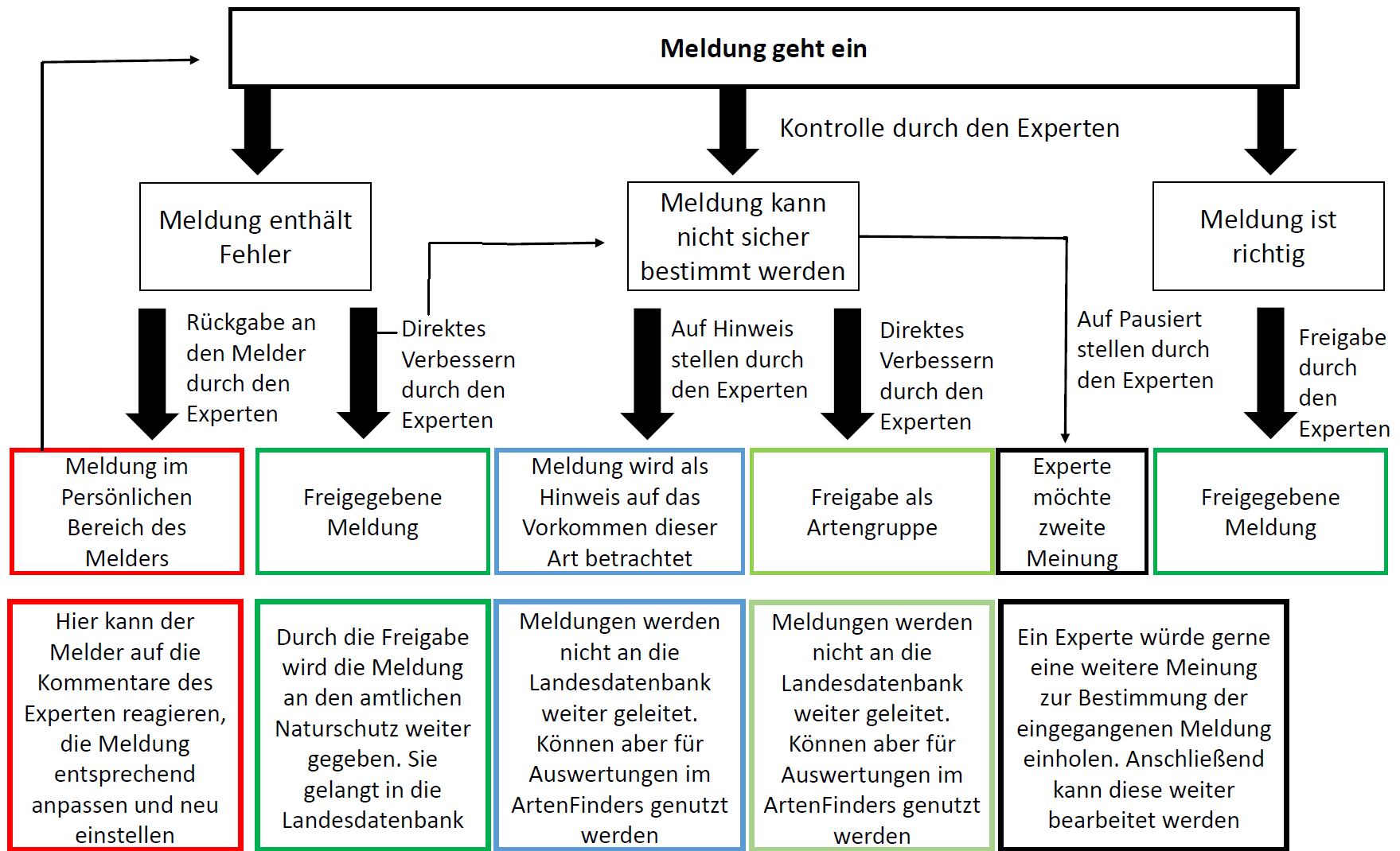 Kann eine Beobachtung nicht anhand des Nachweises bestimmt und belegt werden, wird sie entweder als "Hinweis" auf ein potentielles Vorkommen eingestuft oder abgelehnt. Meldungen mit dem Status "Hinweis" gehen zwar nicht in die zentrale Artdatenbank (LANIS) ein, da sie aber einen Anhaltspunkt für weitere Forschung liefern, können sie in der ArtenAnalyse abgerufen werden. Eine Beobachtung ohne Nachweis, wird nur unter bestimmten Voraussetzungen akzeptiert: