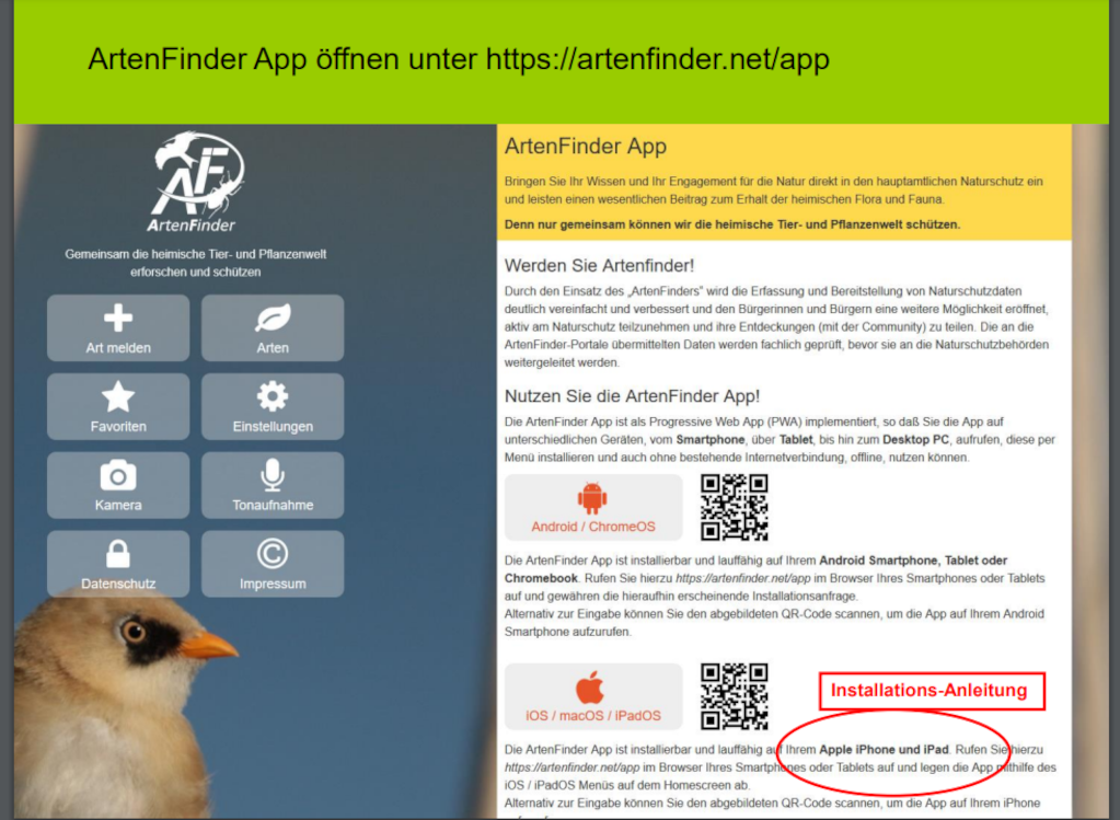 Sie wollen auch direkt aus dem Gelände Meldungen abgeben und einen einfachen Einstieg in die ArtenFinder App? In dieser Anleitung können Sie die Bedienung der App anhand von Beispielen kennen lernen.