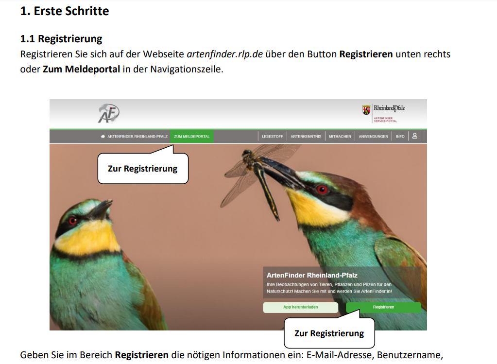 Sie wollen sich einen Überblick über das Portal verschaffen oder haben eine konkrete Frage? Schaue Sie hier in unsere Anleitung. Hier werden die Funktionen im Portal wie z.B. sich im Webportal registrieren, Arten melden, eigene Meldungen verwalten und Beobachtungen von anderen ArtenFinder*innen in der Umgebung entdecken, anhand von Bildern und Texten erklärt.